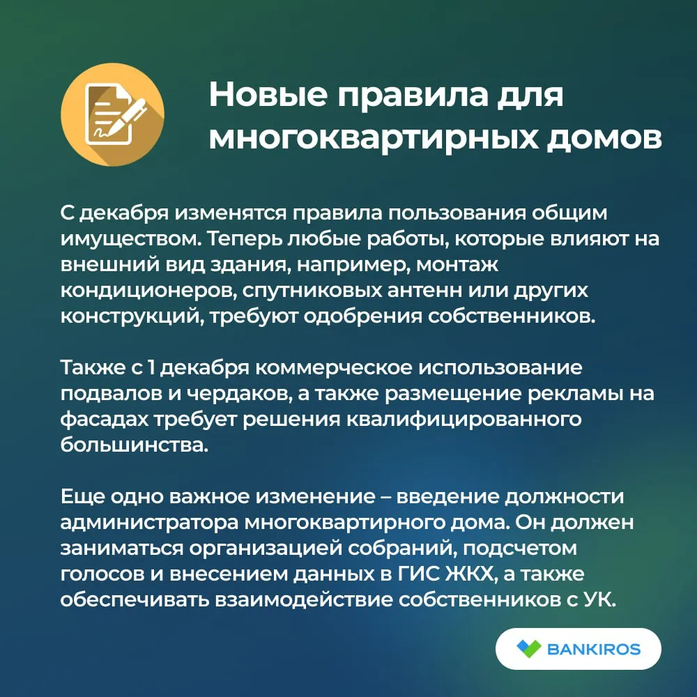 Жильцов многоквартирных домов также ждут изменения. С декабря изменятся правила пользования общим имуществом. Теперь любые работы, которые влияют на внешний вид здания, например, монтаж кондиционеров, спутниковых антенн или других конструкций, требуют одобрения собственников.