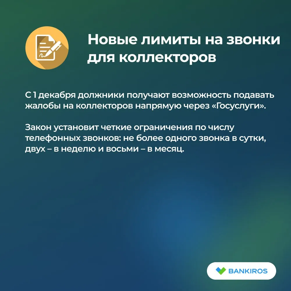 - Вводятся ограничения на звонки коллекторов должникам, а также появится возможность жаловаться на них через «Госуслуги»;