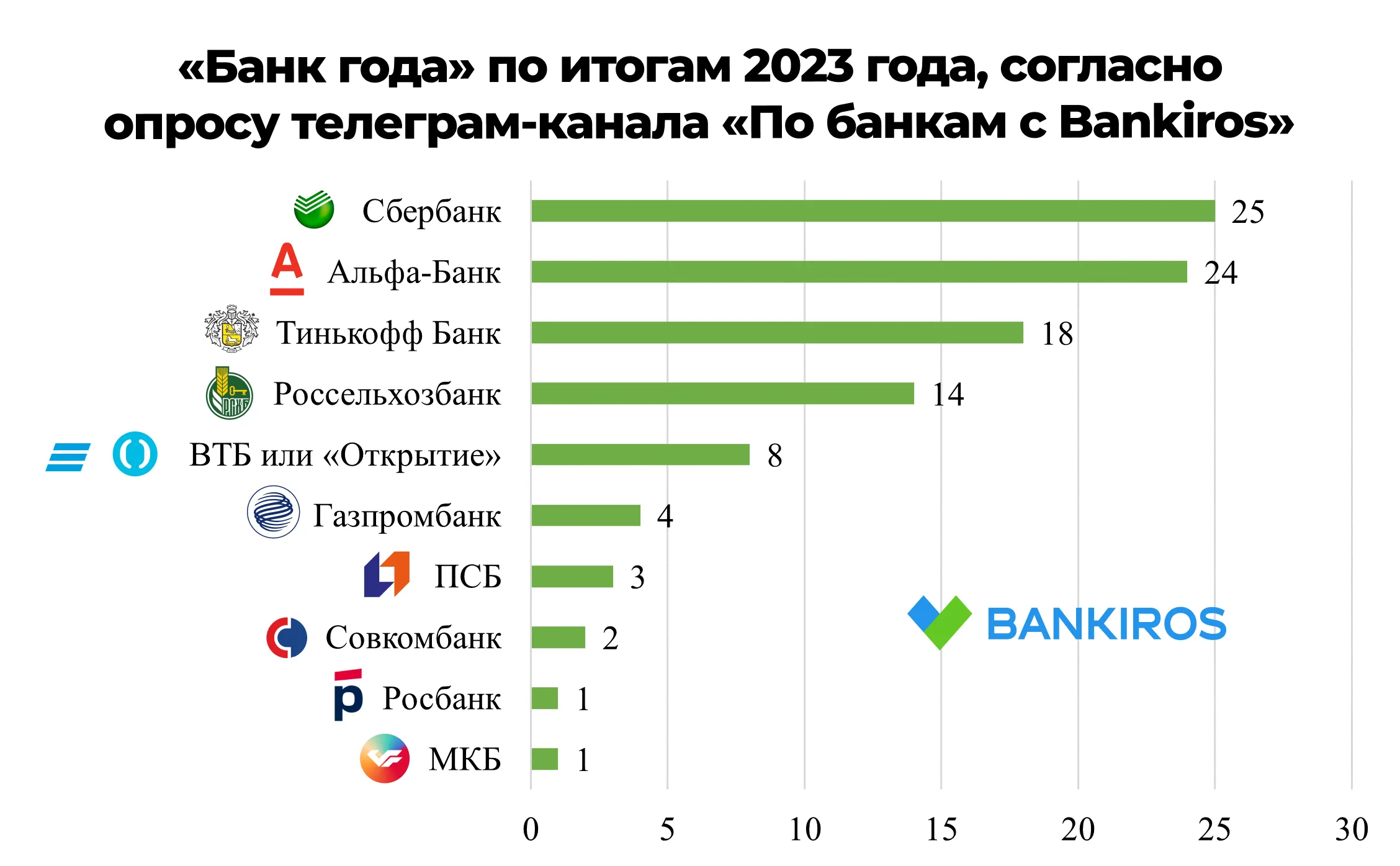 13 декабря телеграм-канал Bankiros.ru спросил читателей, какой из системообразующих банков в России достоин, по их мнению, звания «Банк года». В опросе на момент написания статьи (20 декабря 2023) приняли участие 2 733 человека.