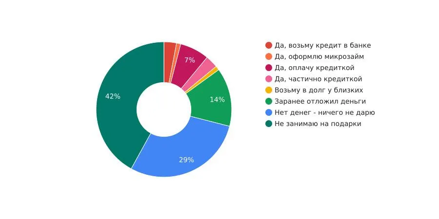 В опросе приняли участие 1359 человек с 12 по 14 декабря. 15% планируют брать в долг на покупки новогодних подарков. Из них 3% ответили, что возьмут кредит в банке на эти цели. Еще 1% возьмут микрозайм, столько же займут у близких. Еще 7% воспользуются кредитной картой, 3% частично оплатят подарки кредиткой.