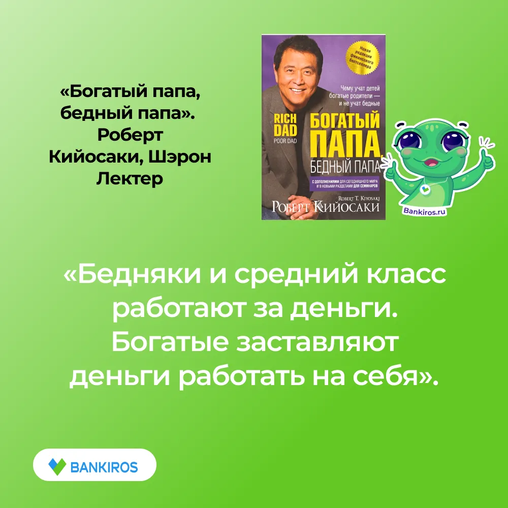 Одной из самых знаменитых книг в финансовых и деловых кругах сегодня считается именно это произведение. Книга известного американского предпринимателя и инвестора учит тому, что необходимо всегда заставлять деньги работать на вас. Работа в найме и трата заработанных средств на ежедневные покупки не сделает вас успешным и богатым. Автор книги рекомендует вложить часть сбережений в активы, которые будут приносить вам дополнительный доход, а не просто лежать «под подушкой».