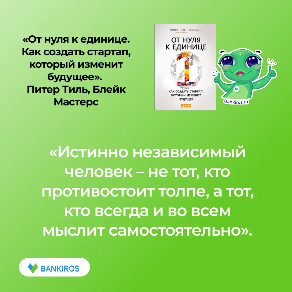 Один из авторов произведения – сооснователь компаний PayPal, инвестор многочисленных стартапов, – Тиль. Он не дает читателям той самой «формулы успешного успеха», но учит самостоятельно выводить ее и искать «ключи» к финансово независимому будущему. В основе книги лежат особенности разработки и запусков стартапов, которые помогут как начинающим бизнесменам, так и более опытным справиться с проблемами и избежать рисков.