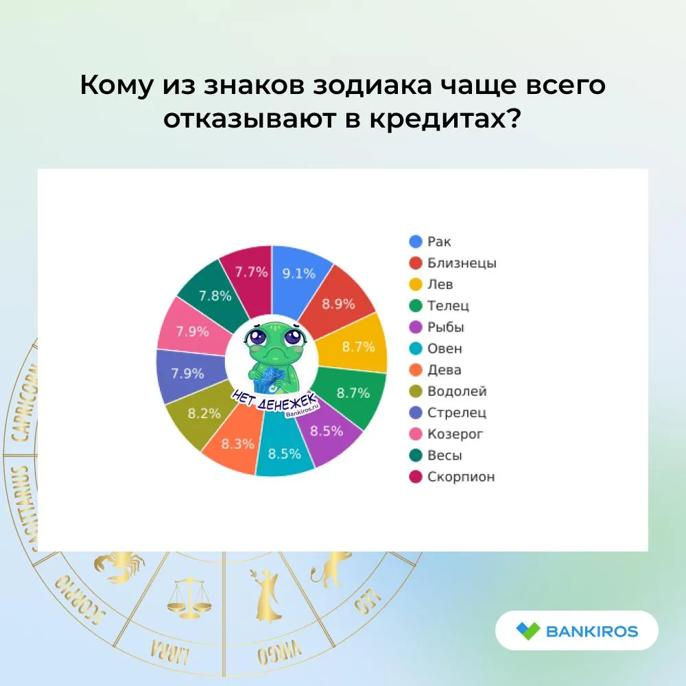 Аналитический центр Bankiros.ru изучил базу заявок на кредиты, поступивших в банки за первый квартал 2024 года и выявил, представителей какого знака зодиака больше среди отказников. Полученные данные мы сравнили с общей статистикой по кредитным заявкам, поступившим в банки в целом.