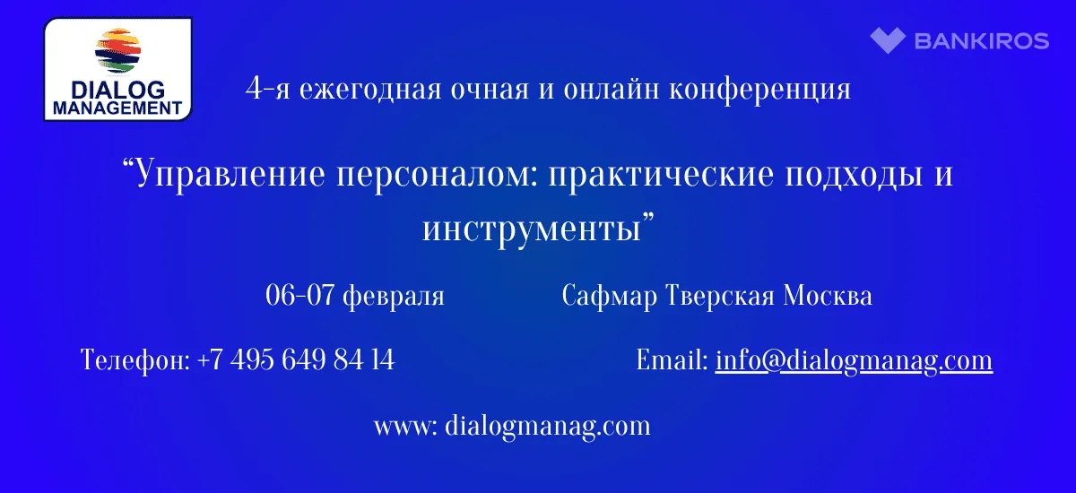 Компания Диалог Менеджмент Партнерс приглашает принять участие в 4-й ежегодной практической ОЧНОЙ и ОНЛАЙН конференции «УПРАВЛЕНИЕ ПЕРСОНАЛОМ: ПРАКТИЧЕСКИЕ ПОДХОДЫ И ИНСТРУМЕНТЫ» которая состоится 06-07 февраля 2025 г. в отеле Сафмар Тверская Москва.