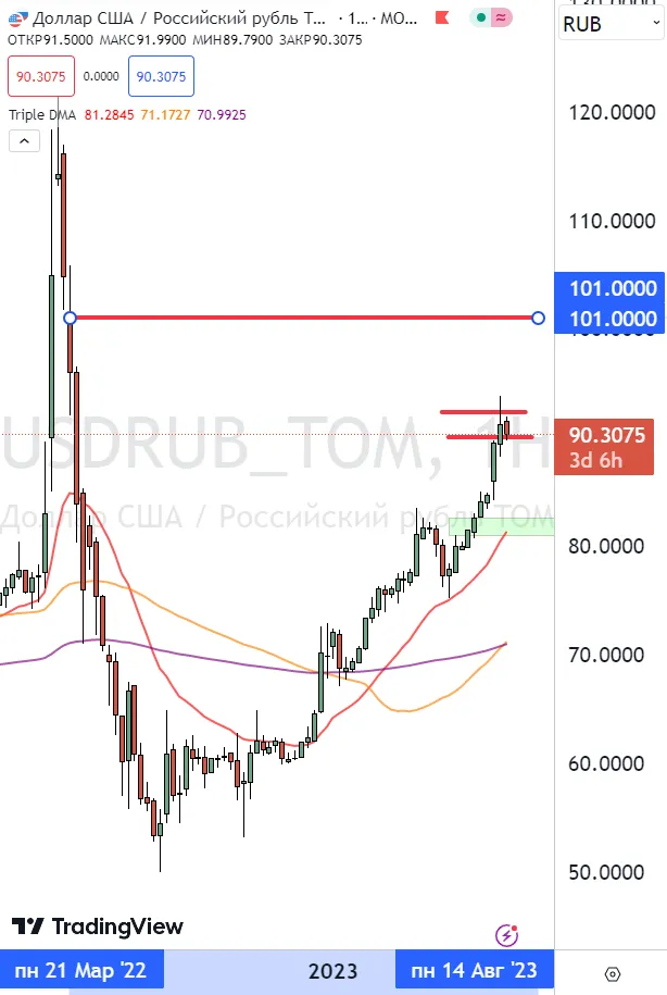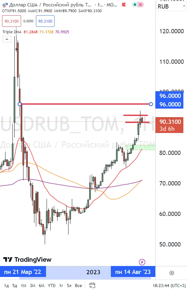 6 июля 2023 года курс доллара к российскому рублю сформировал новый максимум и достиг отметки 93 рубля 85 копеек за один доллар США. Это чуть выше расчетной цены, про которую вы могли читать в прошлом обзоре (Выше 92 рублей за доллар: эксперт наглядно показал, почему валюта будет расти)