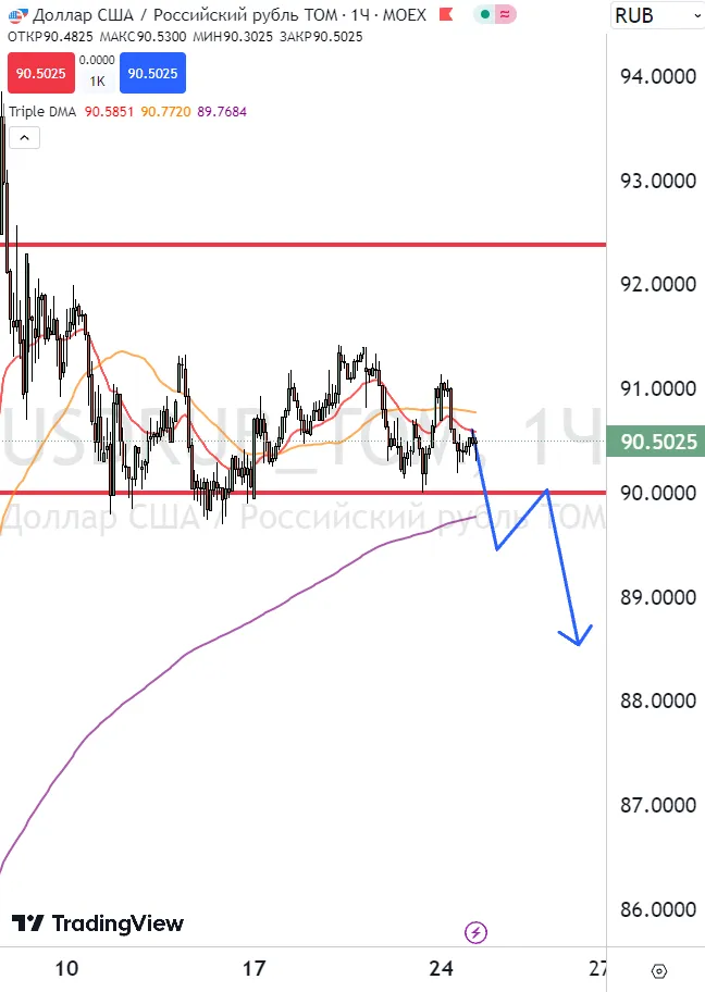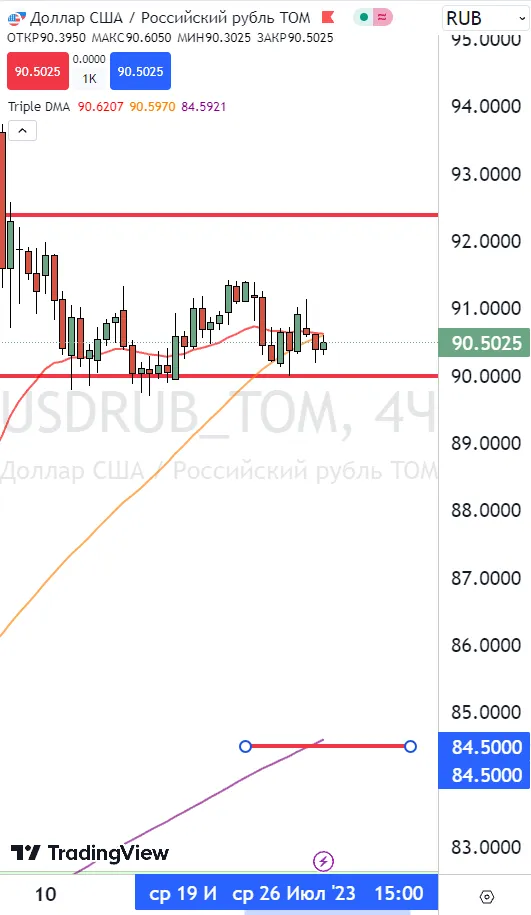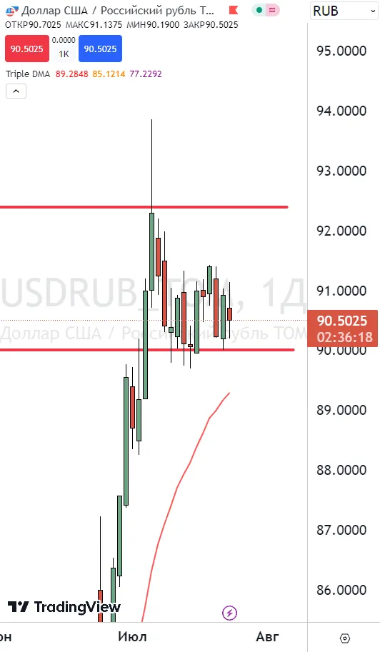 На текущий момент курс пары вернулся к уровню цены в 90 рублей, который выступает в качестве уровня поддержки для графика, минимальная цена до которой опускались котировки 89 рублей 70 копеек.