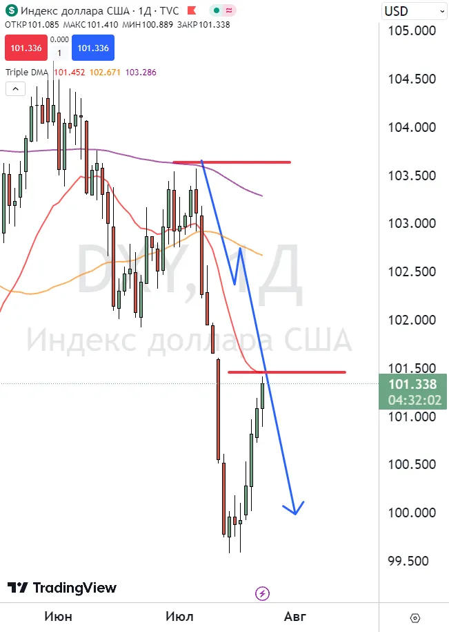 В это же время график индекса DXY формирует нисходящее движение, мы видим что развитие восходящего тренда не получило своего развития и график индекса пошел по негативному сценарию, про который я писал в одном из своих предыдущих прогнозов.