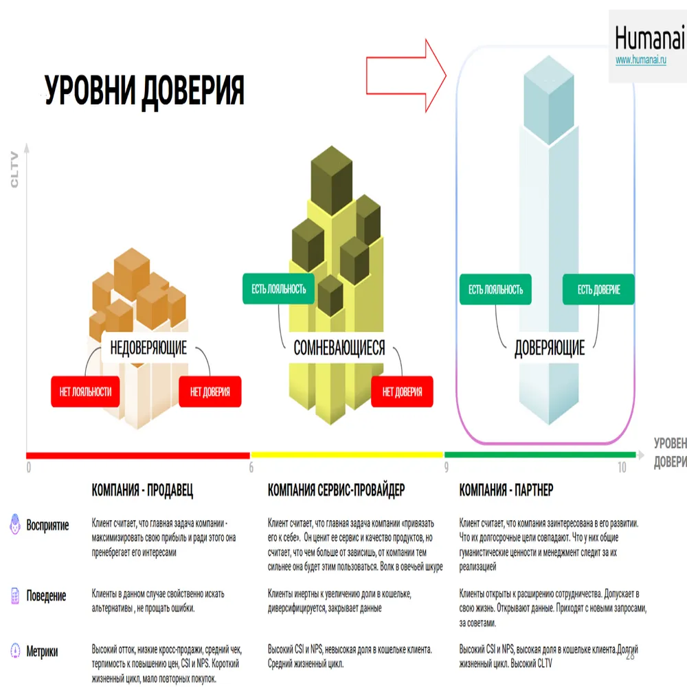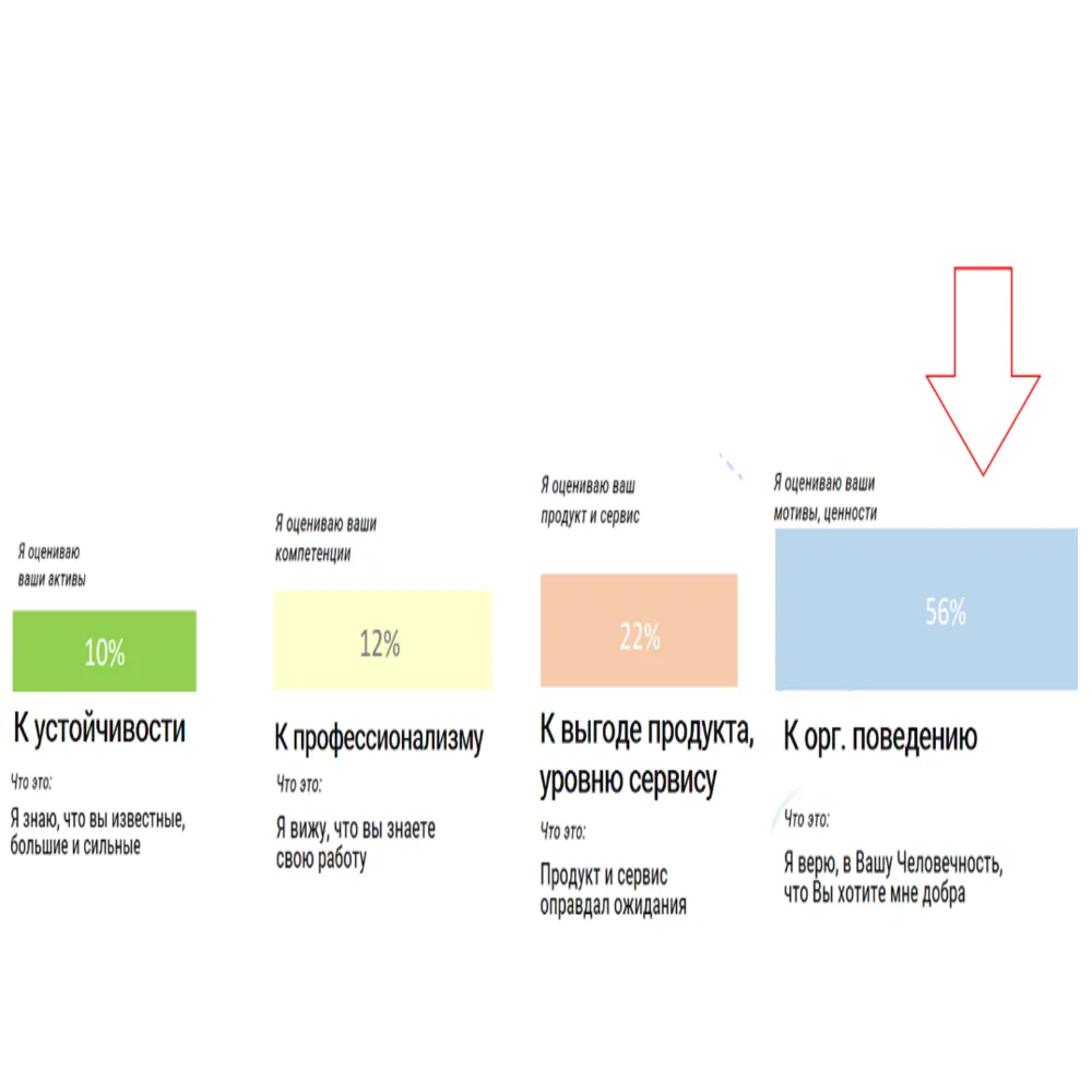 Для построения долгосрочных отношений с клиентами требуется доверие к организационному поведению компании. А именно, что банк будет действовать в ваших долгосрочных интересах, опираясь на гуманистические ценности как на общую базу.