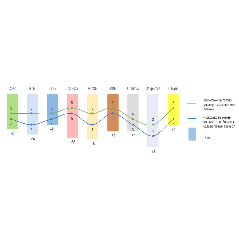 Даже такие лидеры рынка, как СберБанк и Т-Банк, которые занимают большую долю и отличаются высоким качеством сервиса, показали отрицательные результаты NTS – «-47 пп» и «-42 пп» соответственно. Клиенты этих банков оценили готовность расширять сотрудничество и предоставлять больше личных данных на 4,5 из 10 и 5 из 10.