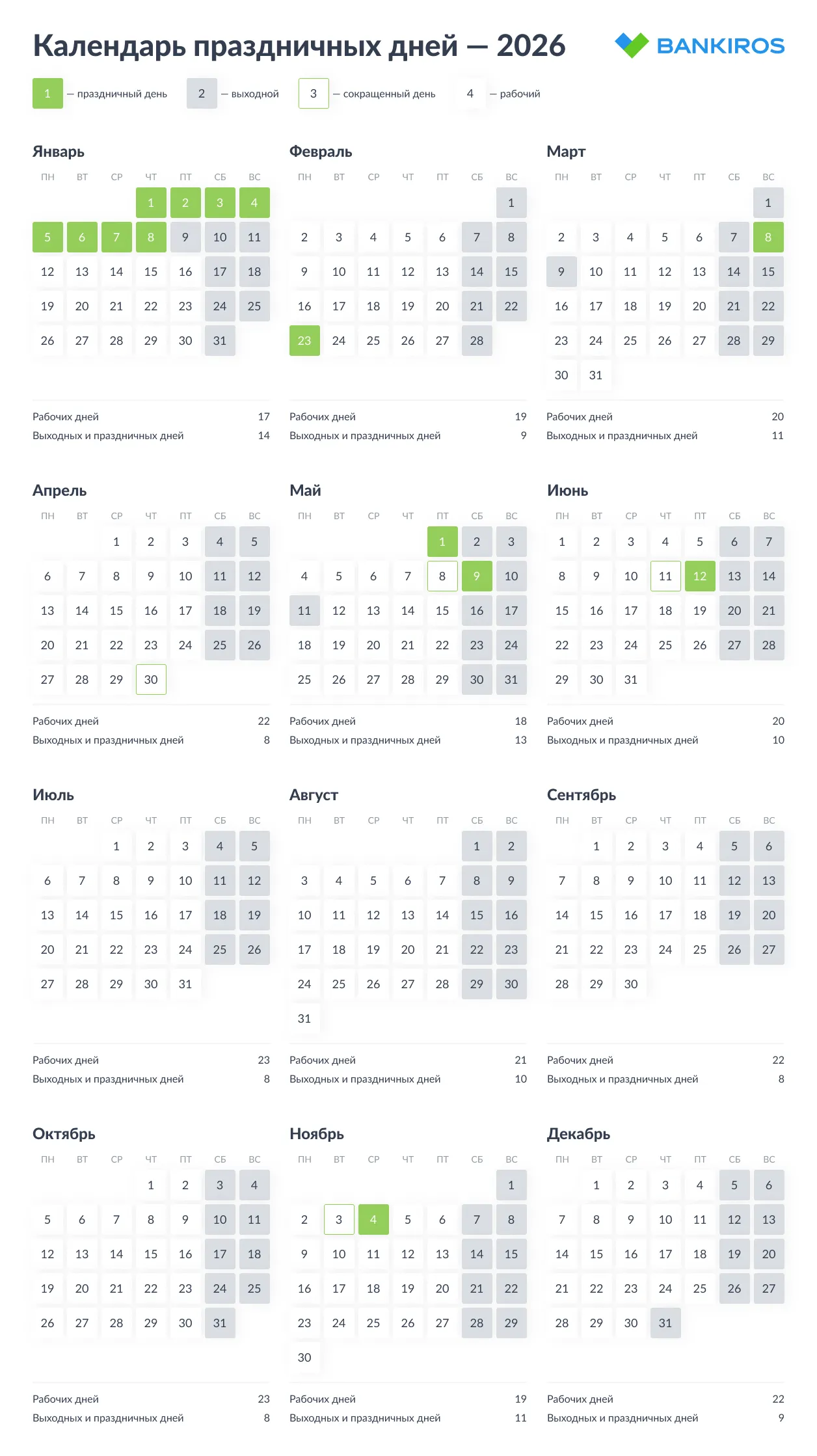 Согласно производственному календарю на 2026 год, в мае россиян, работающих по пятидневному графику, ждут 19 рабочих и 12 выходных дней. Для сравнения, в мае 2025 года было 18 рабочих и 13 выходных дней.