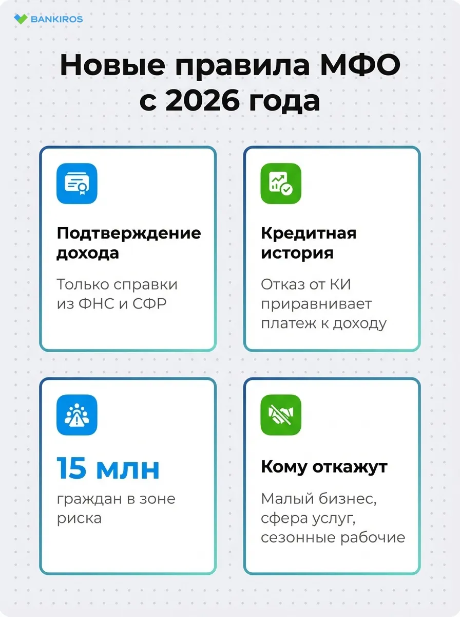 - С начала 2026 года МФО перешли на более жесткие правила оценки платежеспособности: теперь заемщик обязан подтверждать доход документально (справки, данные из ФНС или СФР), самодекларирование больше не допускается;