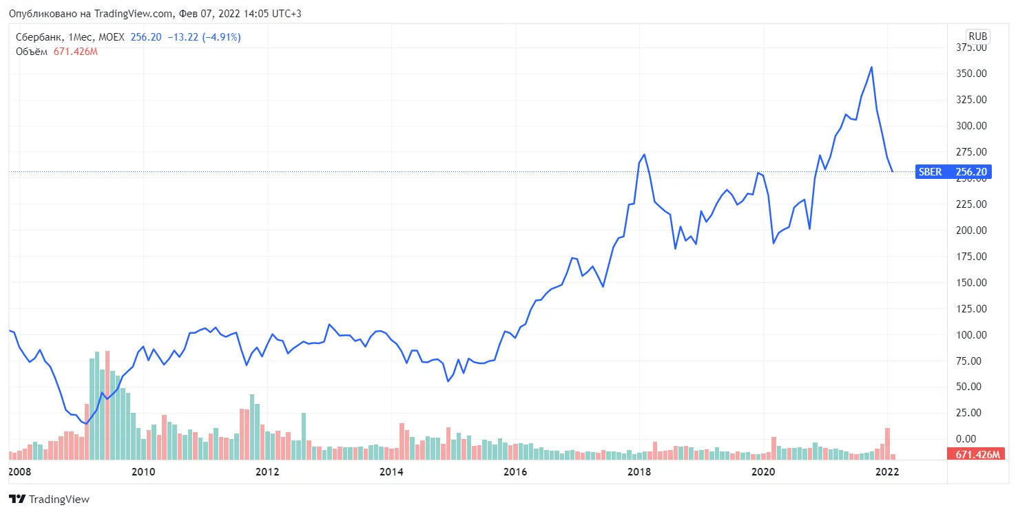 Предположим в 2009 году семья Ивановых решила открыть вклад под 8% (средний показатель) общим сроком в 13 лет (166 месяцев) на период взросления пятилетнего ребенка. Допустим, они не будут делать ежемесячные взносы, а внесут только первоначальную сумму – 100 тысяч рублей. А вот Сидоровы в то же время решили вложить такую же сумму на 13 лет на брокерский счет и купить акции Сбера (опустим принципы диверсификации и портфельного инвестирования ради примера), всего им удалось купить 6 435 акций.