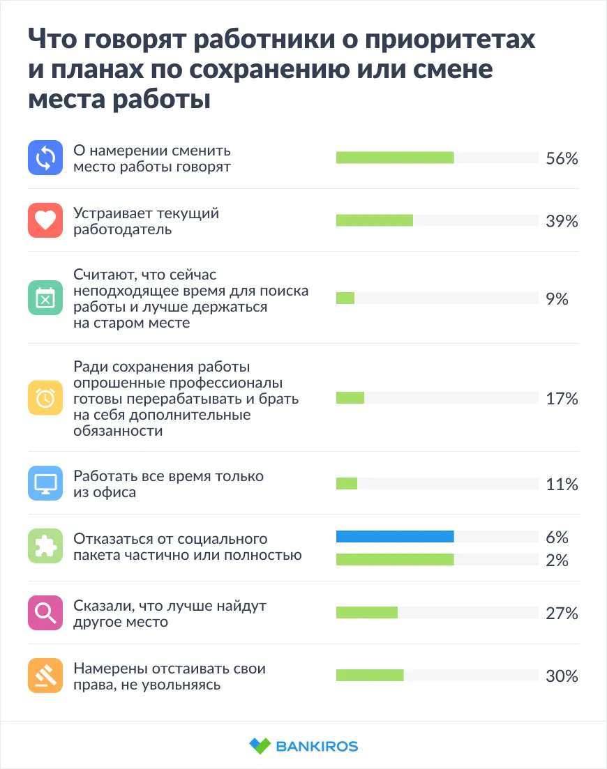Ради сохранения работы опрошенные профессионалы готовы перерабатывать и брать на себя дополнительные обязанности – 17%. Работать все время только из офиса – 11%, отказаться от социального пакета частично – 6% или полностью – 2%. Но большинство не готово чем-то жертвовать: 27% сказали, что лучше найдут другое место, а 30% намерены отстаивать свои права, не увольняясь.