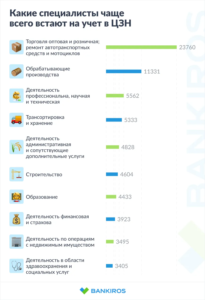 В беседе с Bankiros.ru специалисты пресс-службы Центра занятости населения Санкт-Петербурга рассказали, что в 2021 году на учет по безработице в их отделение вставали специалисты из самых разных областей: торговли, ремонта, обрабатывающего производства, научной, технической деятельности и других сфер. Подробнее об этом можно узнать в нашей специальной инфографике.