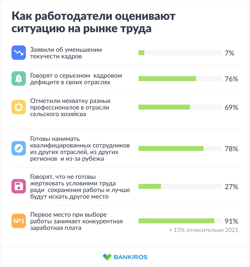 Согласно данным исследования, об уменьшении текучести кадров заявили только семь процентов работодателей. Около 76% работодателей говорят о серьезном кадровом дефиците в своих отраслях.