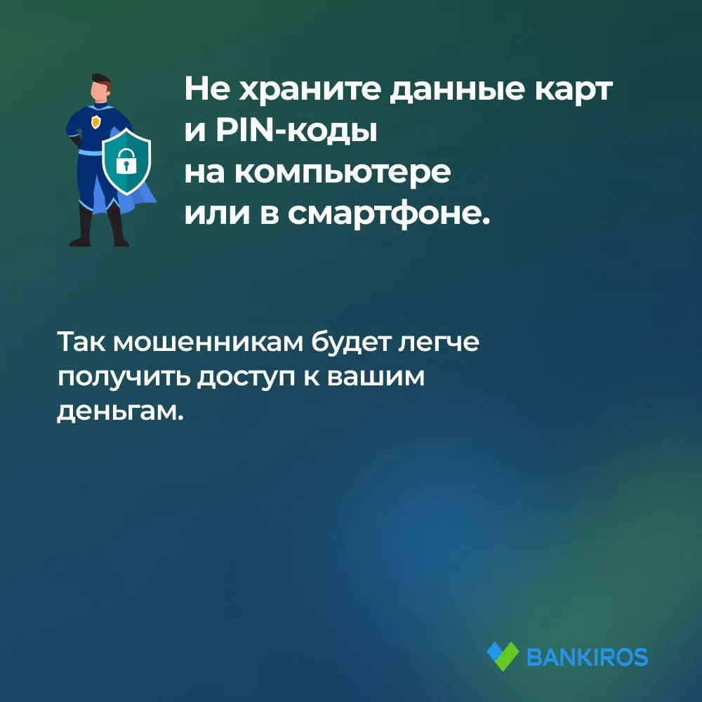 - Не храните данные карт и PIN-коды на компьютере или в смартфоне.