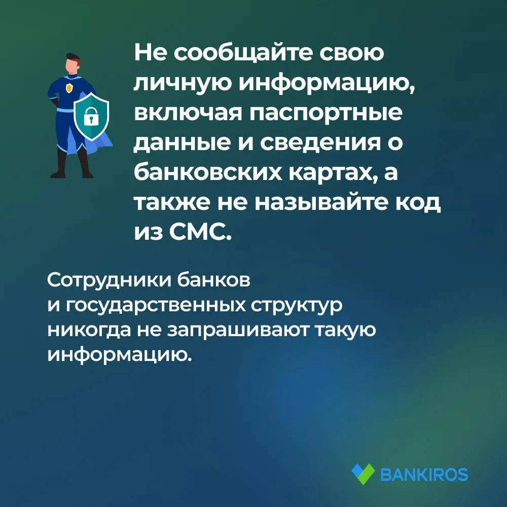 - Не сообщайте свою личную информацию, включая паспортные данные и сведения о банковских картах, а также не называйте код из СМС. Сотрудники банков и государственных структур никогда не запрашивают такую информацию.