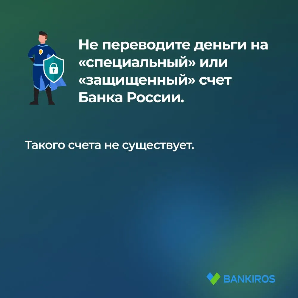 - Не переводите деньги на «специальный» или «защищенный» счет Банка России – такого счета не существует.