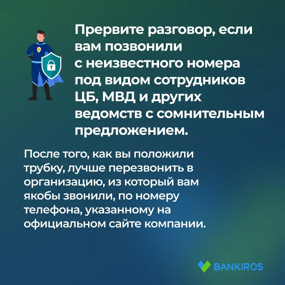 - Прервите разговор, если вам позвонили с неизвестного номера под видом сотрудников Центробанка, правоохранительных органов, государственной организации или банка с сомнительным предложением, стали запугивать и требовать быстрых решений с финансами. После того, как вы положили трубку, лучше перезвонить в организацию, из который вам якобы звонили, по номеру телефона, указанному на официальном сайте компании.