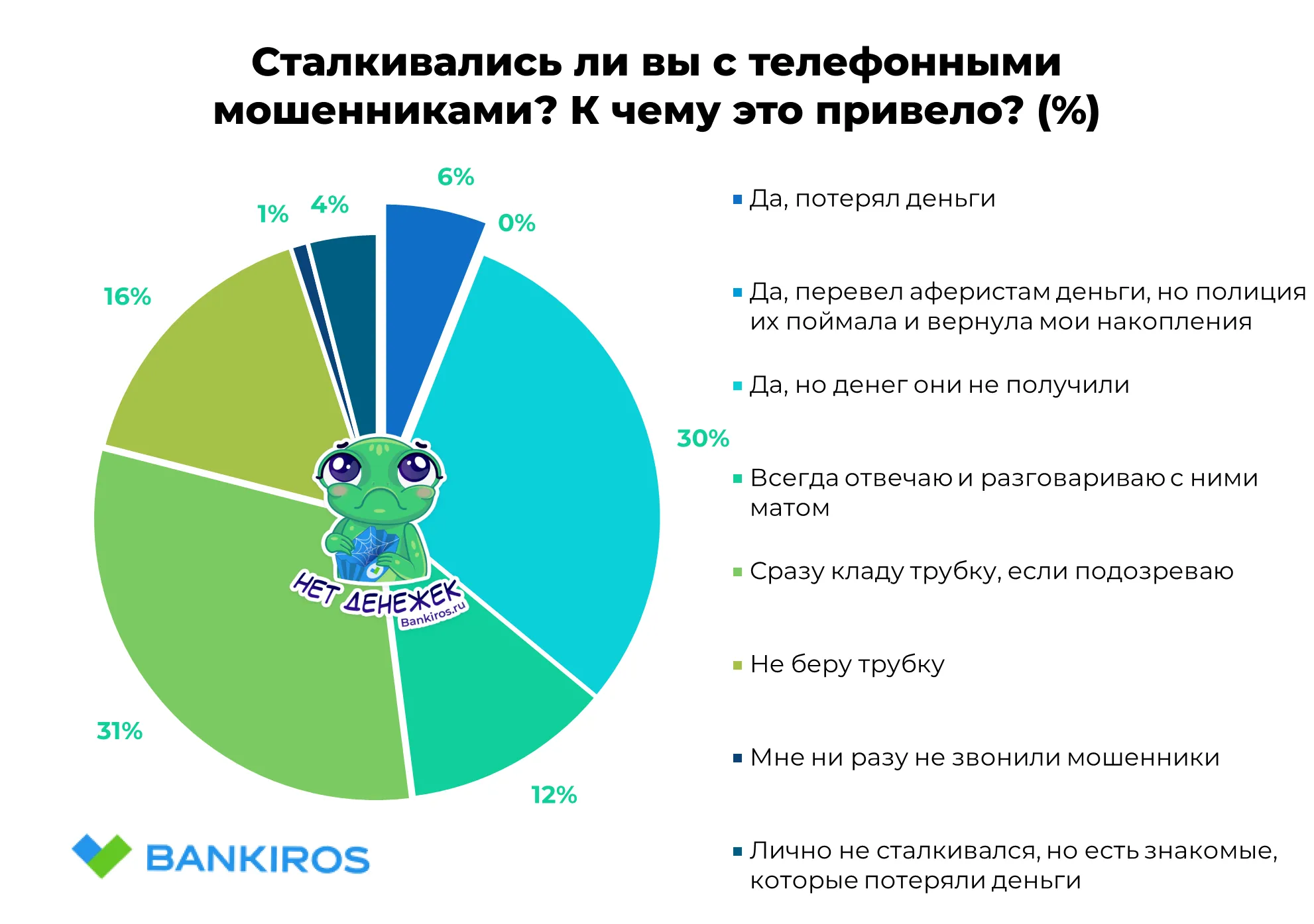 Согласно опросу Bankiros.ru, почти половина россиян просто отстраняются от мошенников. Из них почти каждый третий гражданин сразу же прерывает разговор и кладет трубку, если у него появляются подозрения, а 16% опрошенных и вовсе не берут трубку от незнакомцев.