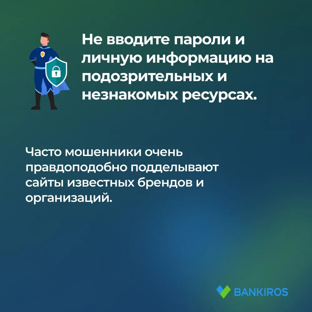 - Не вводите пароли и личную информацию на подозрительных и незнакомых ресурсах. Часто мошенники очень правдоподобно подделывают сайты известных брендов и организаций.