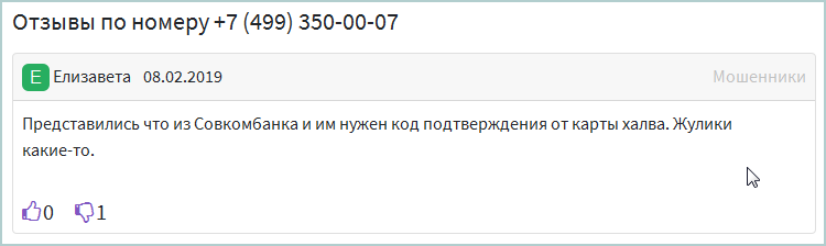 На форуме Banki.ru пользователь под ником PoTaS сообщил об участившихся звонках мошенников, которые представляются "службой безопасности Совкомбанка". По словам клиента кредитной организации, злоумышленники звонят каждый раз после того, как банк высылает СМС-код для подтверждения оплаты через интернет. Мошенники просят назвать содержание СМС.