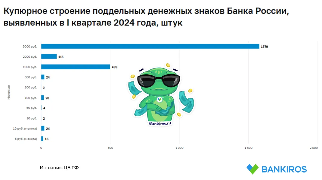 Согласно данным ЦБ, в первом квартале 2024 года было обнаружено 2 286 поддельных денежных знаков. Самой популярной подделкой стала банкнота номиналом пять тысяч рублей. Меньше всего выявлено поддельных банкнот номиналом 10 рублей.