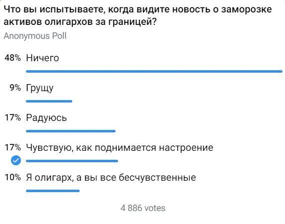 Обычные россияне им не сочувствуют – как показал опрос Bankiros.ru, сопереживают богатым и подсанкционным лишь 9%. А каждому третьему такие новости и вовсе дарят хорошее настроение.