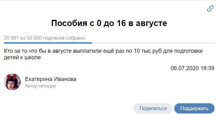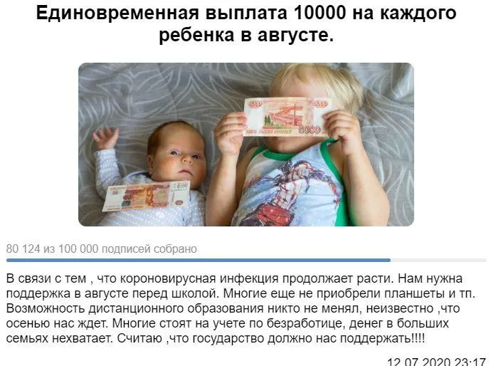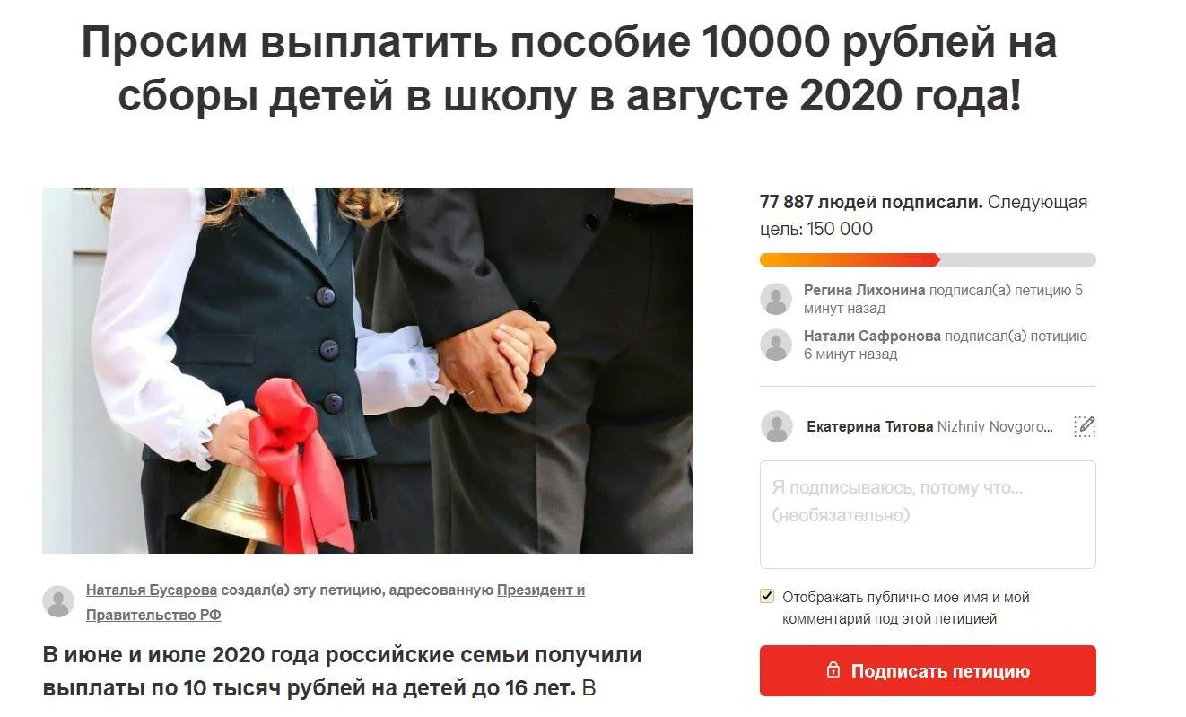 В петициях создатели обращаются к президенту Путину и просят продлить единовременную выплату в 10 тысяч рублей на каждого ребенка до 16 лет еще и на август. Как отмечают авторы, экономическая ситуация в стране не наладилась, а в сентябре детям идти в школу. Дабы «не влезать в кредиты» родители просят у государства продлить единовременные выплаты.