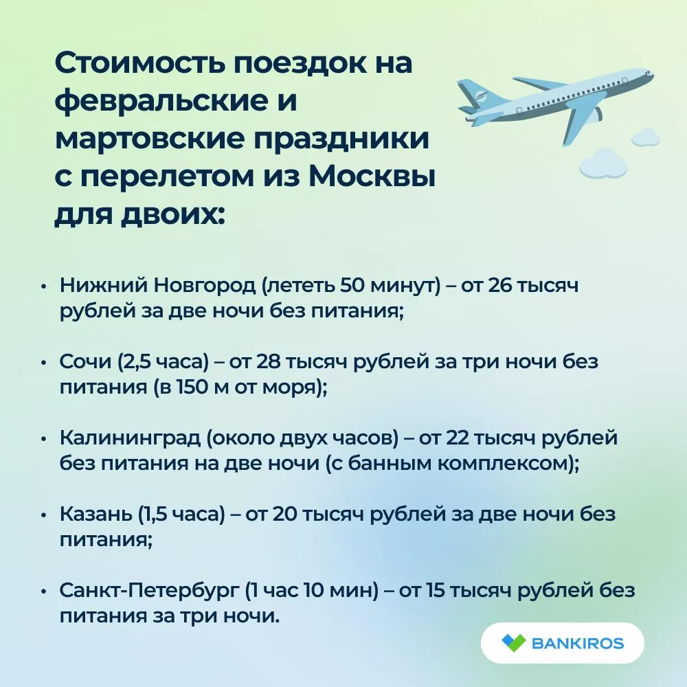 Два самых популярных направления для культурного или романтического отдыха (что особенно актуально на 8 марта) – Москва и Санкт-Петербург, обращает внимание эксперт.