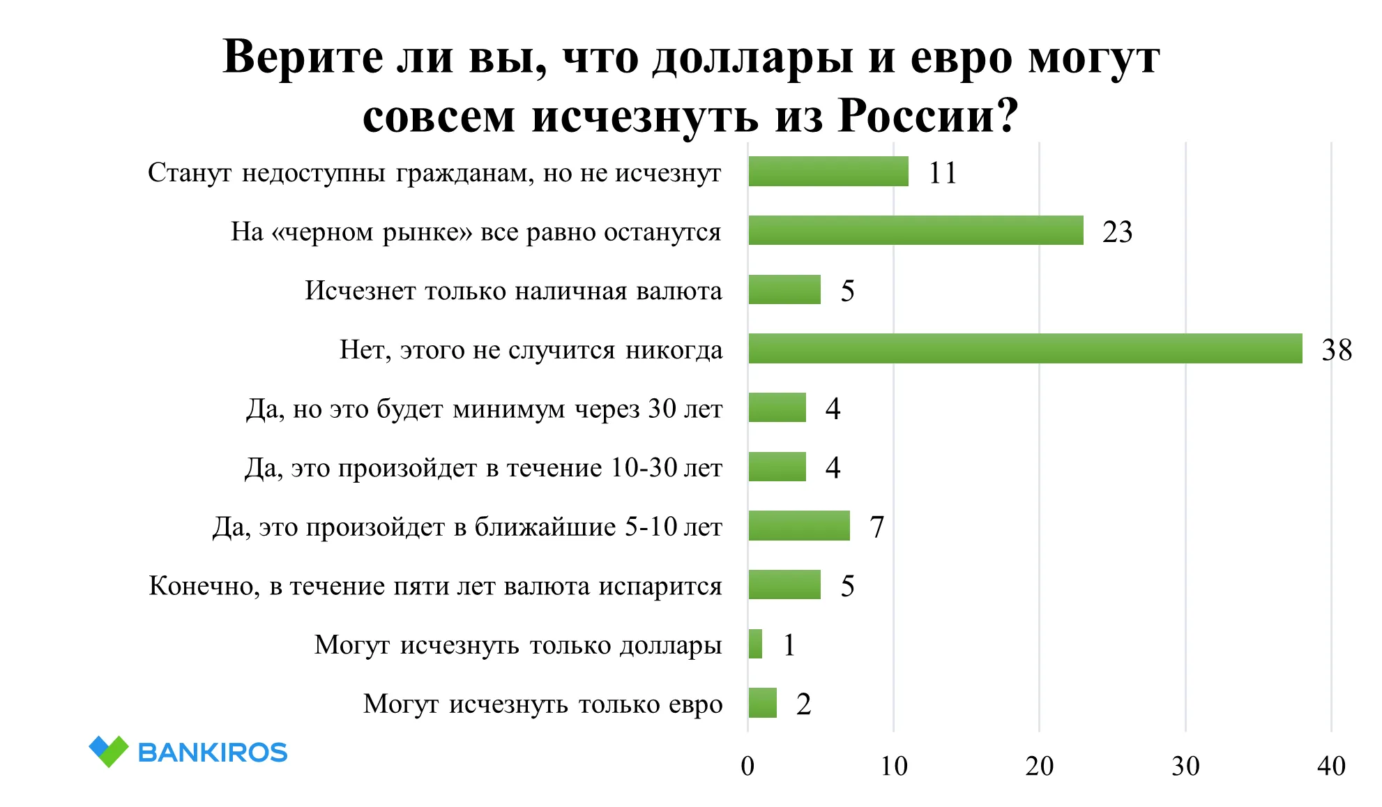 Большая часть граждан (38%) однозначно уверена, что ни доллары, ни евро никогда не переведутся из России. 23% опрошенных допустили, что даже если валюта исчезнет с российского рынка, то на «черном рынке» можно будет всегда найти американскую и европейскую валюту.