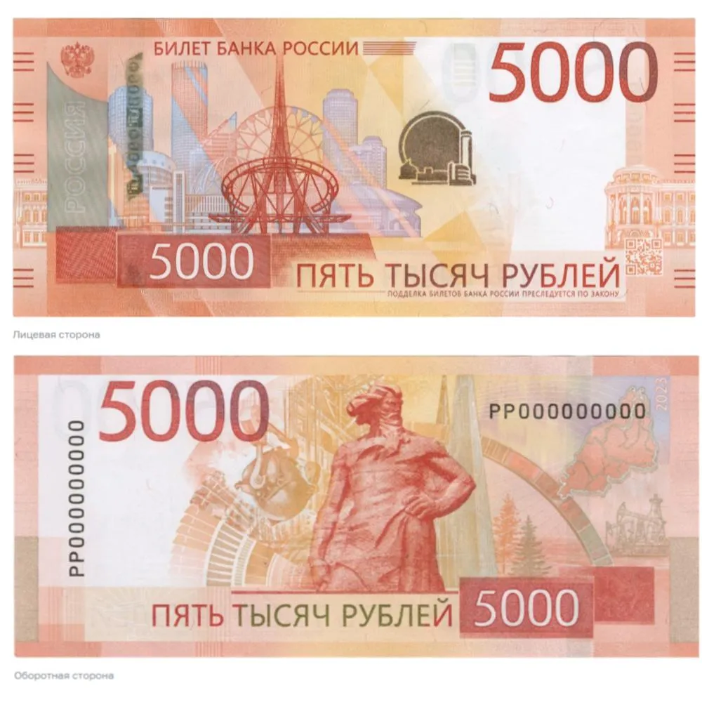 На новой купюре номиналом в пять тысяч рублей можно увидеть достопримечательности Уральского федерального округа. На лицевой стороне банкноты изображен Екатеринбург. Главным элементом композиции стала стела «Европа – Азия», символизирующая границу между двумя континентами.