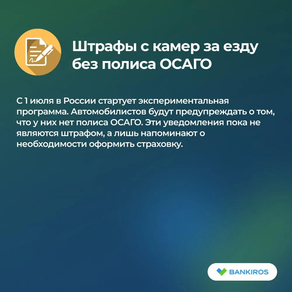 С 1 июля в России стартует экспериментальная программа. Автомобилистов будут предупреждать о том, что у них нет полиса ОСАГО. Эти уведомления пока не являются штрафом, а лишь напоминают о необходимости оформить страховку.