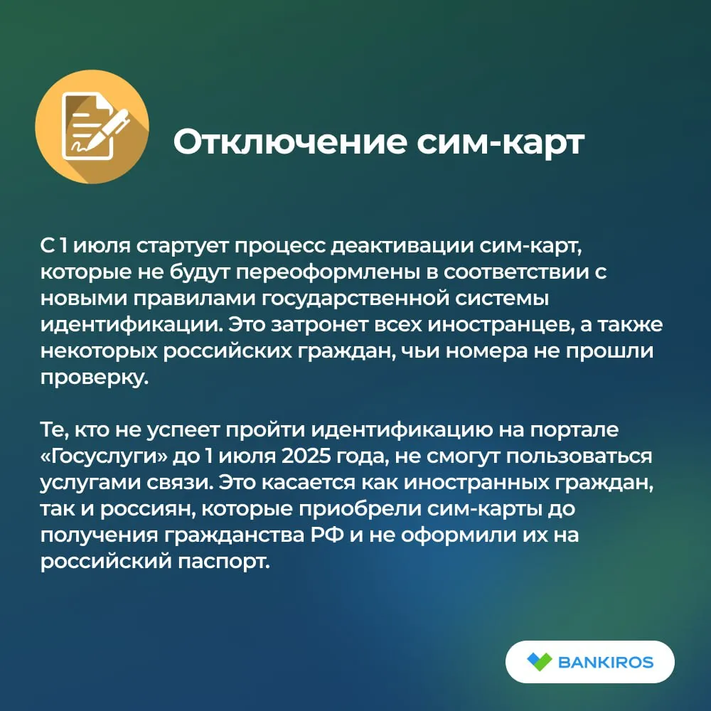 С 1 июля стартует процесс деактивации сим-карт, которые не будут переоформлены в соответствии с новыми правилами государственной системы идентификации. Это затронет всех иностранцев, а также некоторых российских граждан, чьи номера не прошли проверку.