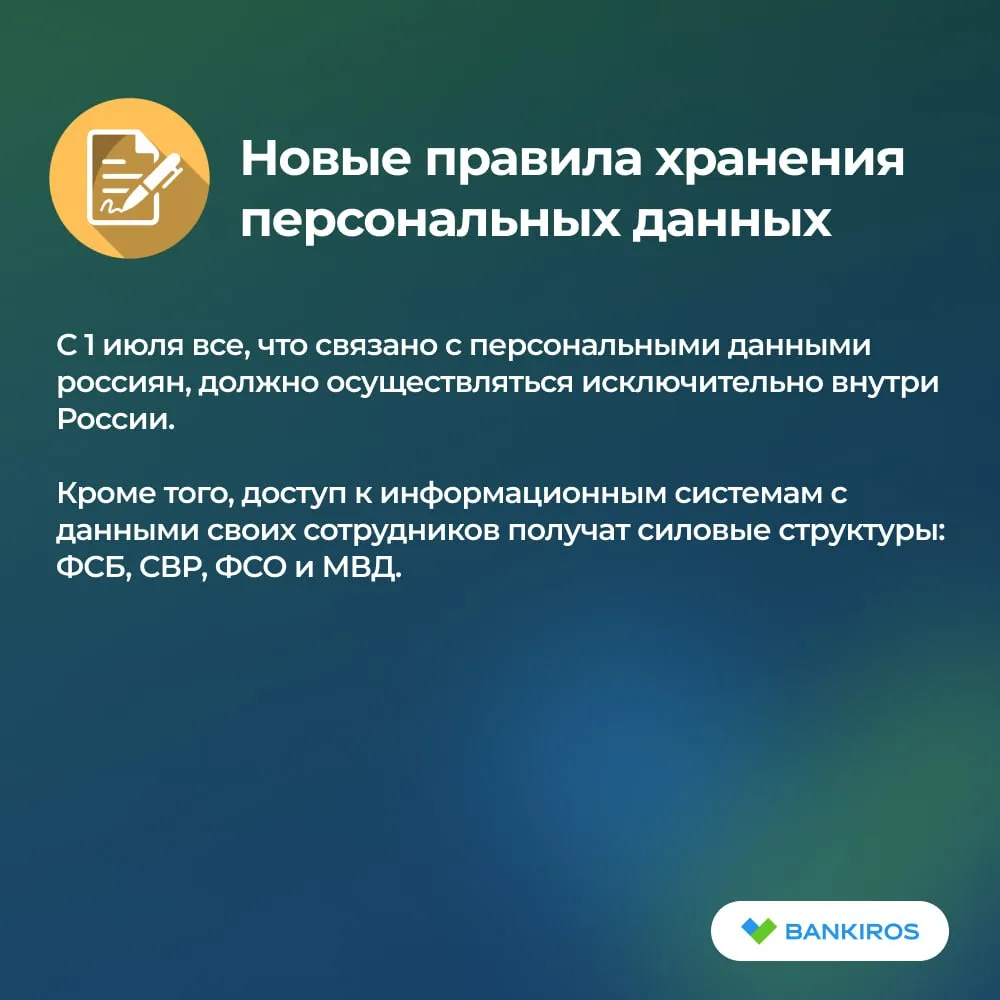 С 1 июля все, что связано с персональными данными россиян – сбор, обработка, хранение, передача и удаление – должно осуществляться исключительно внутри России. Кроме того, доступ к информационным системам с данными своих сотрудников получат силовые структуры: ФСБ, СВР, ФСО и МВД.