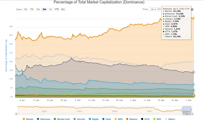 К середине января доля эфириума в общей рыночной стоимости рынка выросла до 20%, когда монете Бутерина покорился максимум в 1400 долларов.