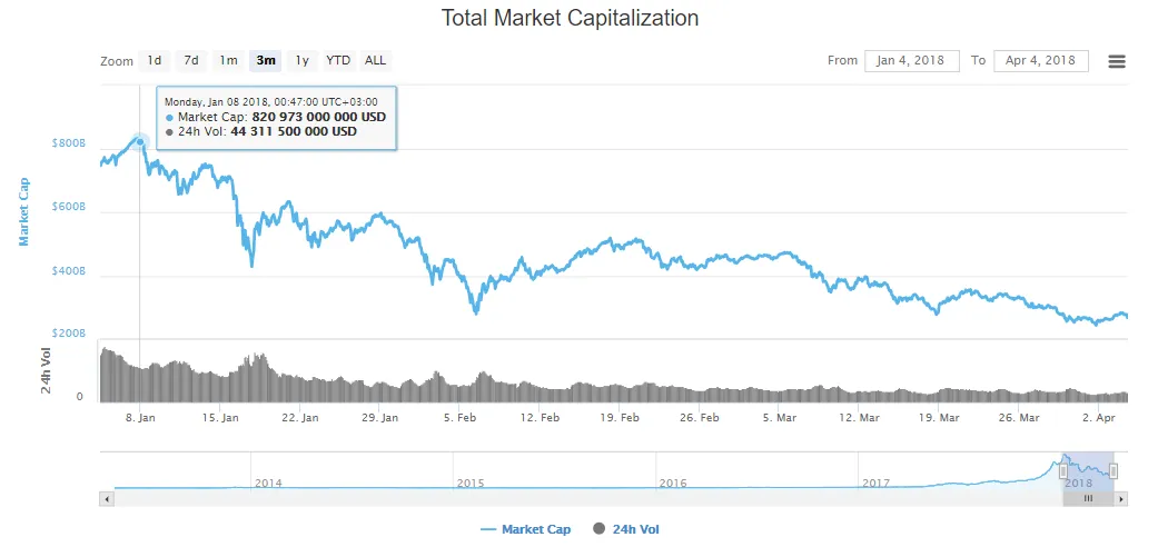 В первом квартале 2018 года индустрия цифровых активов продемонстрировала наихудшие результаты последних пяти лет. За три месяца биткоин упал на 50%, курсовые значения многих альткоинов опустились на 70%, а общая капитализация рынка криптовалют снизилась на 59%.