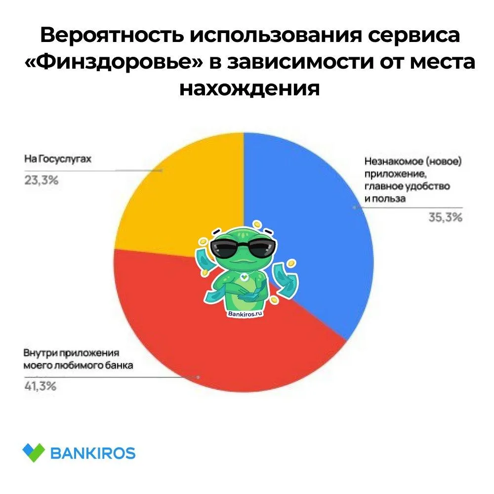 Как оказалось, пользователям важно, на какой платформе будет размещен сервис «Финздоровье». Так, 41,3% россиян готовы использовать его в своих любимых банковских приложениях. 35,3% респондентов не против скачать новое или незнакомое приложение, если оно будет удобным и полезным. Еще 23,3% участников опроса готовы пользоваться сервисом, если он будет доступен на портале «Госуслуги».