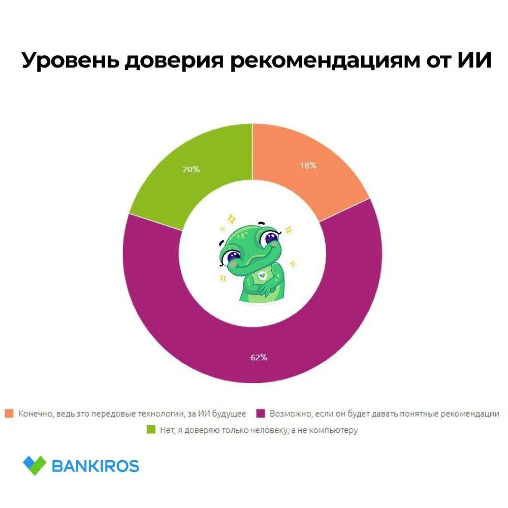 Результаты опроса показали, что 62% респондентов могут следовать советам искусственного интеллекта, если они будут понятны. 18% участников опроса считают, что за ИИ будущее, поэтому доверять ему не только можно, но и нужно. Однако 20% респондентов не готовы следовать рекомендациям компьютера и доверяют только человеку.