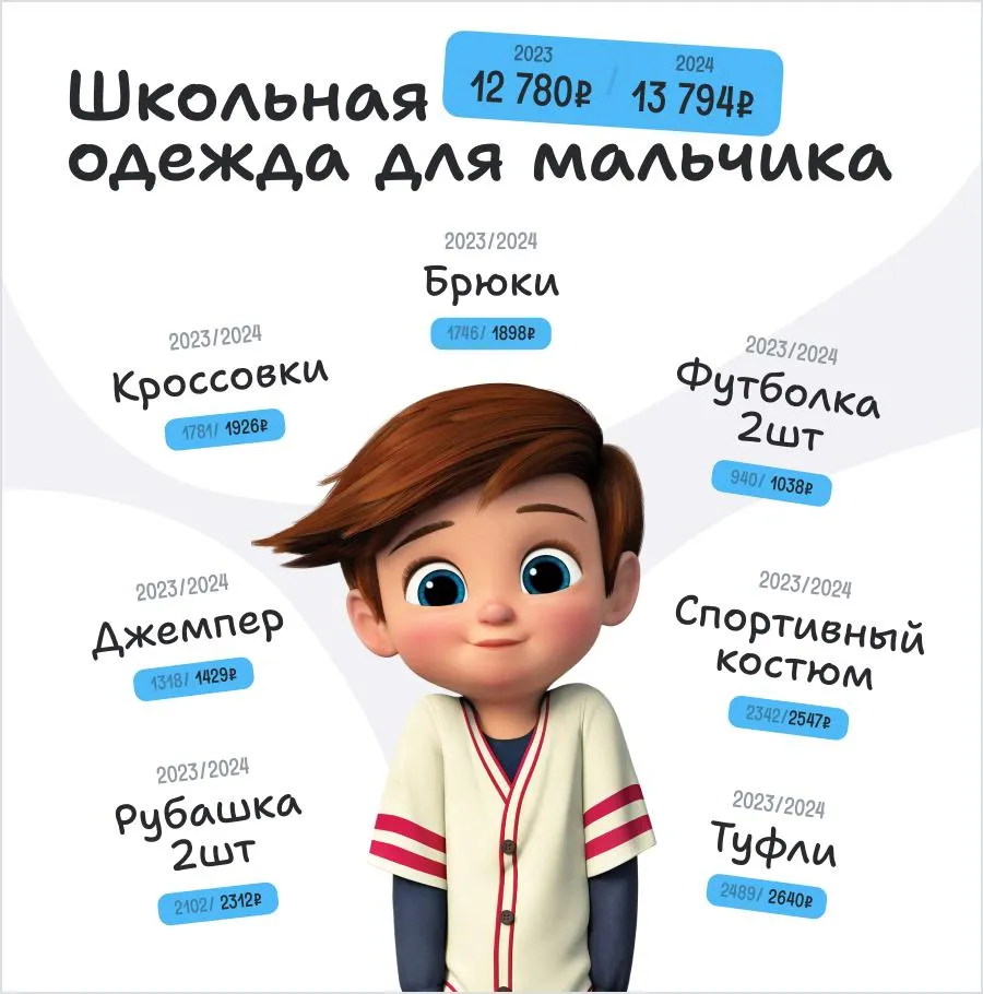 - В 2024 году купить одежду мальчику к школе будет стоить в среднем 13 тысяч рублей, для девочки – 16 тысяч рублей.