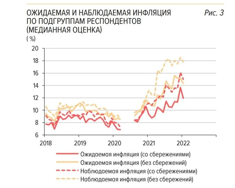 При этом инфляционные ожидания у россиян с запасом средств отличаются от тех, кто не имеет никаких сбережений. Так, наблюдаемая инфляция по оценкам людей без накоплений составляет 17,9%, а ожидаемая – около 14,5%. Тем временем у второй группы граждан показатели составляют – 15% и 11,9% соответственно.