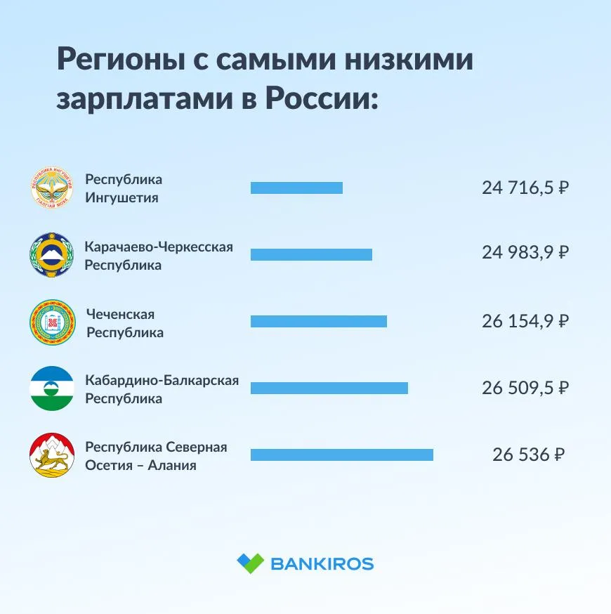 - Самые низкие зарплаты в Республике Ингушетия – 24, 7 тысячи рублей.