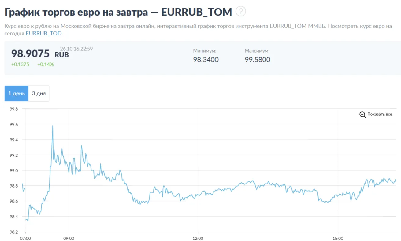26 октября рубль немного ослабил позиции и позволил иностранной валюте хоть и немного, но отыграть падение. Доллар поднимался выше отметки в 94 рубля – до 94,41, евро пробивал уровень 99. Об этом свидетельствуют данные торгов на Мосбирже, представленные на сайте Bankiros.ru.