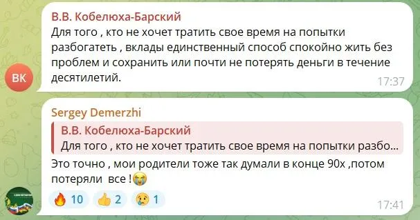 Некоторые россияне не доверяют высоким ставкам по депозитам и опасаются повторения ситуации со сбережениями в 90-х годах, когда потерянные средства не вернули. Об этом в комментариях пишут подписчики telegram-канала Bankiros.ru.