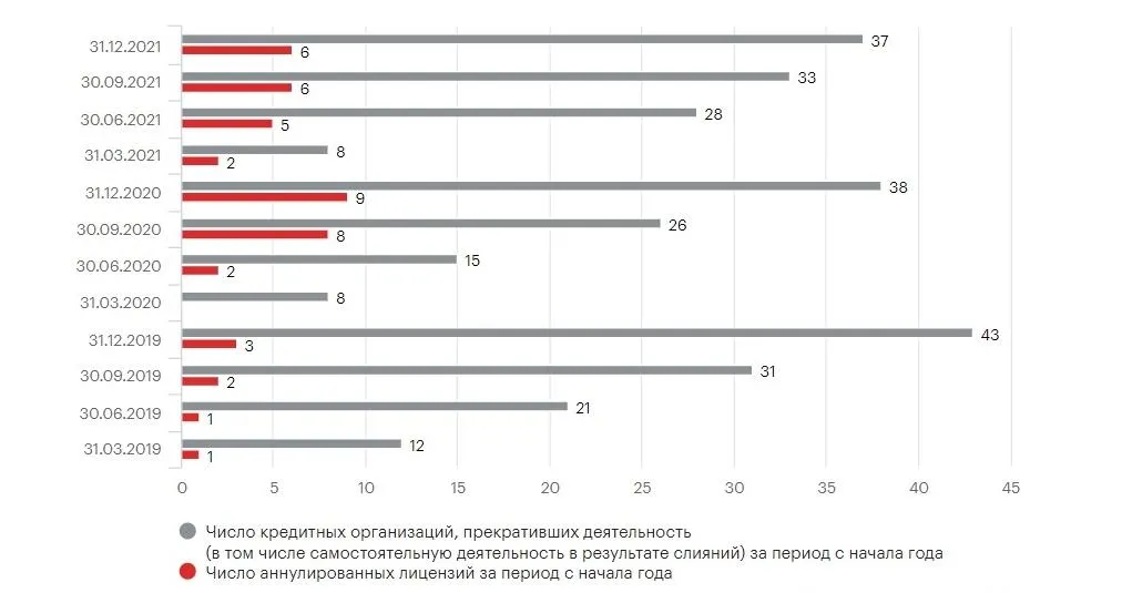 В прошлом году свою деятельность прекратили 37 кредитных организаций, в том числе 26 – по регуляторным основаниям, шесть – в результате добровольной сдачи лицензии, пять – после реорганизации и присоединения к другим банкам. В четвертом квартале 2021 года прекратили работу только четыре организации.