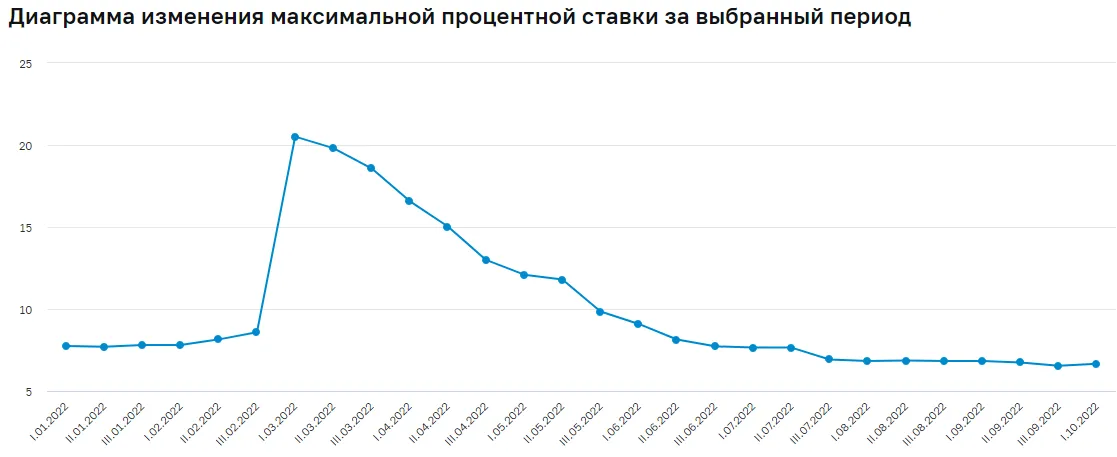В первой декаде марта 2022 года показатель средней максимальной ставки поставил абсолютный рекорд. После начала военных действий на Украине ставка по вкладам увеличилась на 11,92% и составила 20,51%. С этого периода средняя максимальная ставка стала постепенно снижаться вплоть до второй декады августа.