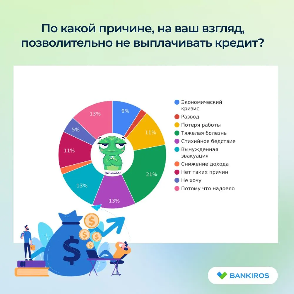 Аналитический центр Bankiros.ru изучил данные опроса, проводившегося в нашем Телеграм-канале с 19 сентября по 8 октября. Мы спросили у наших читателей, какую причину не выплачивать кредит они считают самой веской. В голосовании приняли участие 1449 человек.