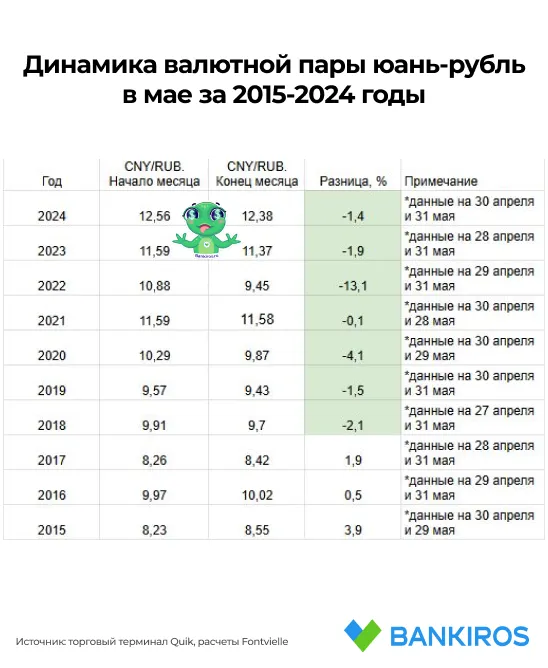 Май является благоприятным для российской валюты месяцем, если проанализировать движение валютных пар доллар-рубль, евро-рубль и юань-рубль в конце весны за последние 10 лет. При этом резких колебаний в этот месяц обычно не происходило, рассказал Bankiros.ru руководитель аналитического управления по глобальным рынкам ИК Fontvielle Артур Мейнхард.