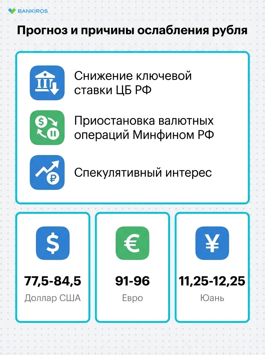 - Ослабление позиций рубля было вызвано ожиданиями снижения ключевой ставки ЦБ, приостановкой операций с золотовалютными резервами со стороны Минфина РФ и спекулятивным интересом.