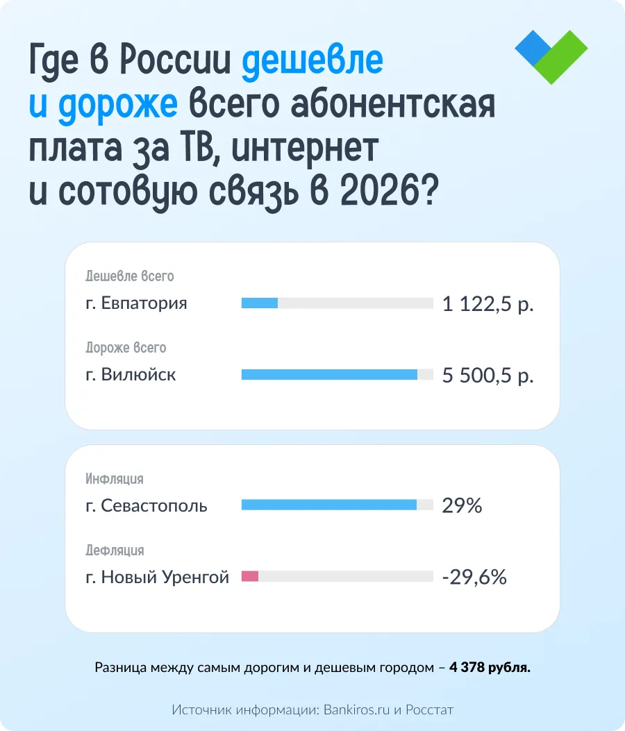 Наш рейтинг будет полезен всем гражданам, так как многие из нас пользуются телевизором, и каждый – интернетом и сотовой связью ежедневно и исправно платят абонентскую плату каждый месяц. Стоимость услуг мы нашли в последних опубликованных данных Росстата за ноябрь 2025 года.
